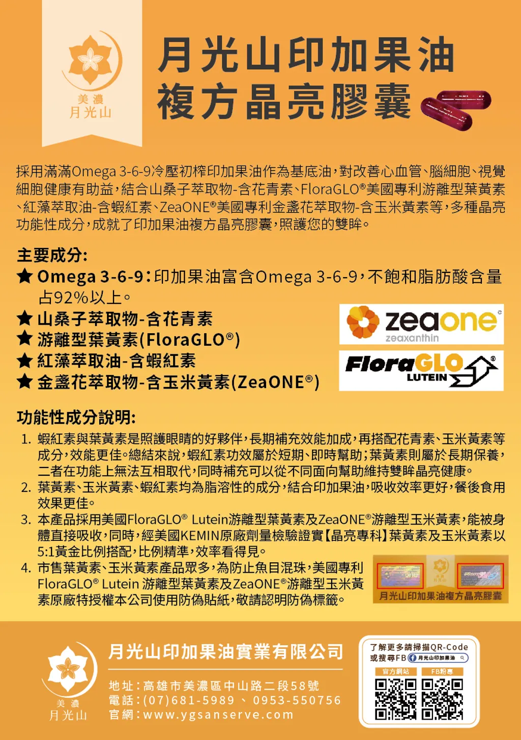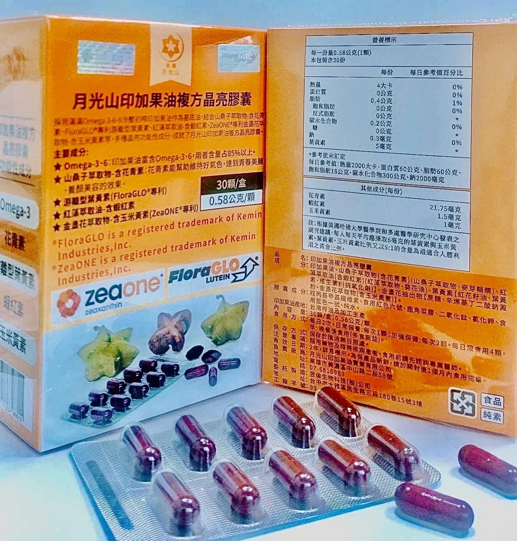 採用滿滿Omega 3-6-9冷壓初榨印加果油作為基底油,對改善心血管、腦細胞、視覺細胞健康有助益,結合山桑子萃取物-含花青素、FloraGLO®美國專利游離型葉黃素、紅藻萃取油-含蝦紅素、ZeaONE®美國專利金盞花萃取物-含玉米黃素等,多種晶亮功能性成分,成就了印加果油複方晶亮膠囊,照護您的雙眸。